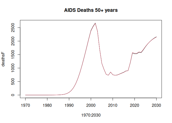 plot(1970:2030, deathsF, type = "l", main = "AIDS Deaths 50+ years")